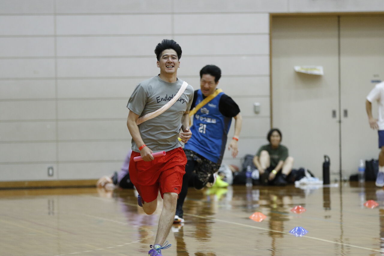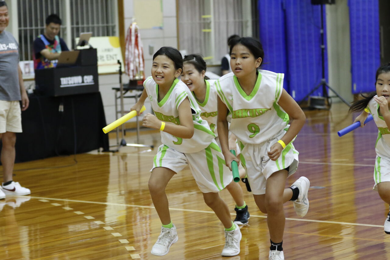 今回のアトラクションは広い家原体育館を生かして、リレー対決にしました!